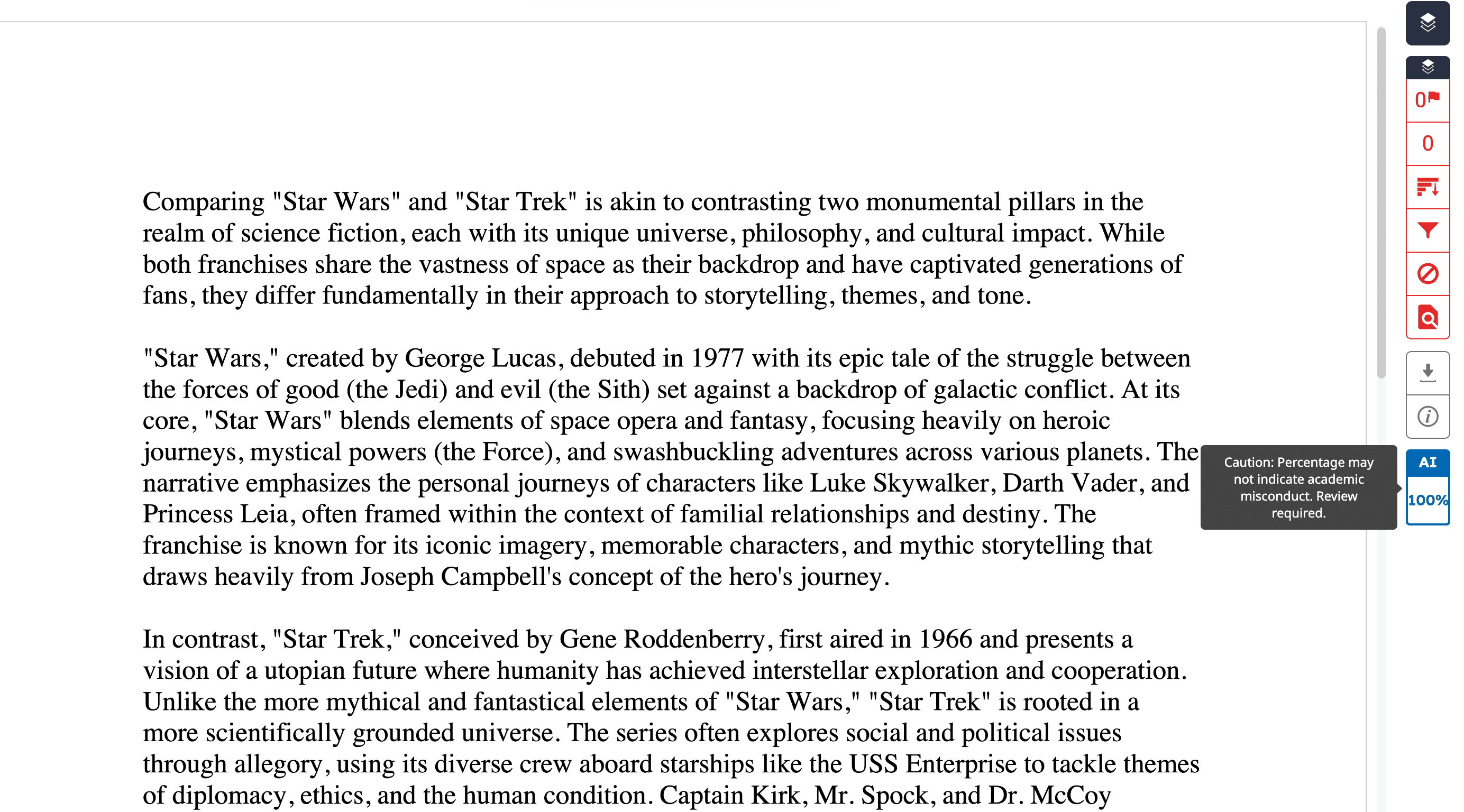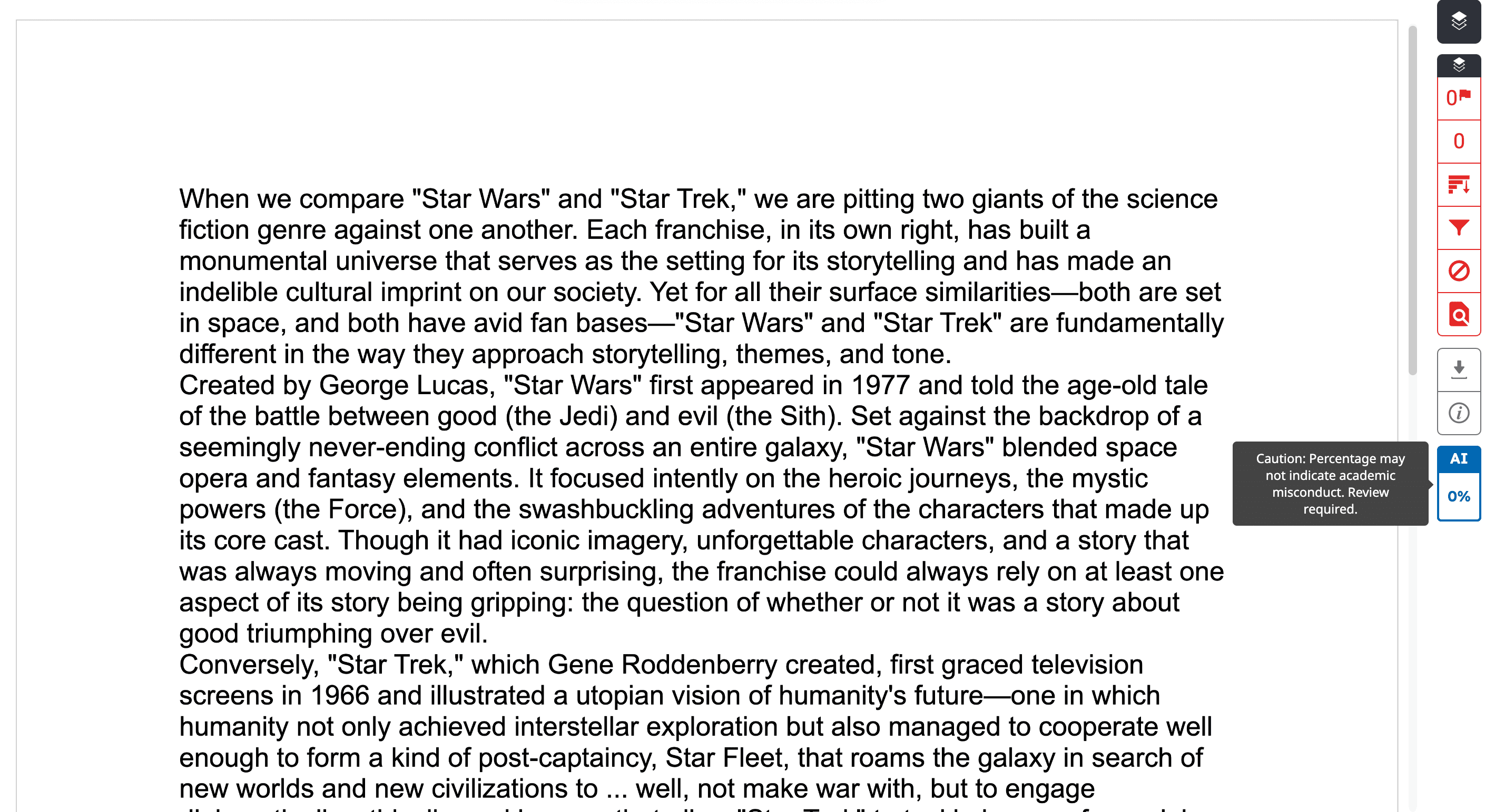 Using ChatGPT, we created text with a mere 1% Human rating. A score that would get us in trouble if we ever decided to submit this text in as homework. The readability of the text is also low and the grade level is rather high, making it a red flag for anyone attempted to actually read it before passing it through an AI content detector.The thing about AI Detect is though, our engine is so powerful, it’ll catch details other detectors miss. That’s why if we want to use text with a zero AI score, we’ll have to test it against Turnitin.If you were to ask university faculty what the best AI detector is, they will probably say Turnitin. Not because it’s the most functional, but because it’s already integrated into academia at large as part of the Canvas and Blackboard submission portals.Here’s our ChatGPT text run through Turnitin: