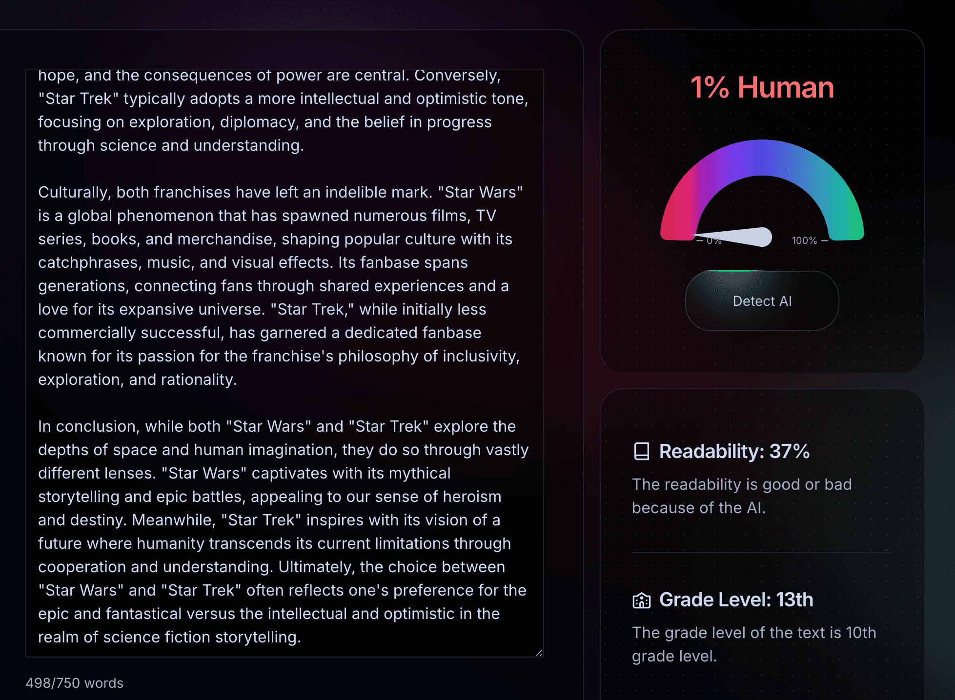 Powerful AI Detectors don’t just tell you if the piece of AI-generated content you pass through it is AI-written or not, they give you a score that tells you a lot about your text. In the case of AI Detect, you can learn about a piece of text’s readability and grade level to help you assess how well your text will fare once you submit it for people to read.Lets say you’re not just using AI detectors for fun though. Lets say you’re a student that wants to test your essay before submitting it to your professor to ensure you don’t get caught using an AI model then accused of plagiarism. AI Detect has an AI humanizer built in so you can simply click your text and make it submittable.Once humanized, your text's AI score should decrease to make it seem like you’re using human writing instead of AI writing. That might not be enough to get a professor off your scent though. If you want to ensure the investigation ends after you bypass AI detectors, you need your text to get a score of zero from AI detection.