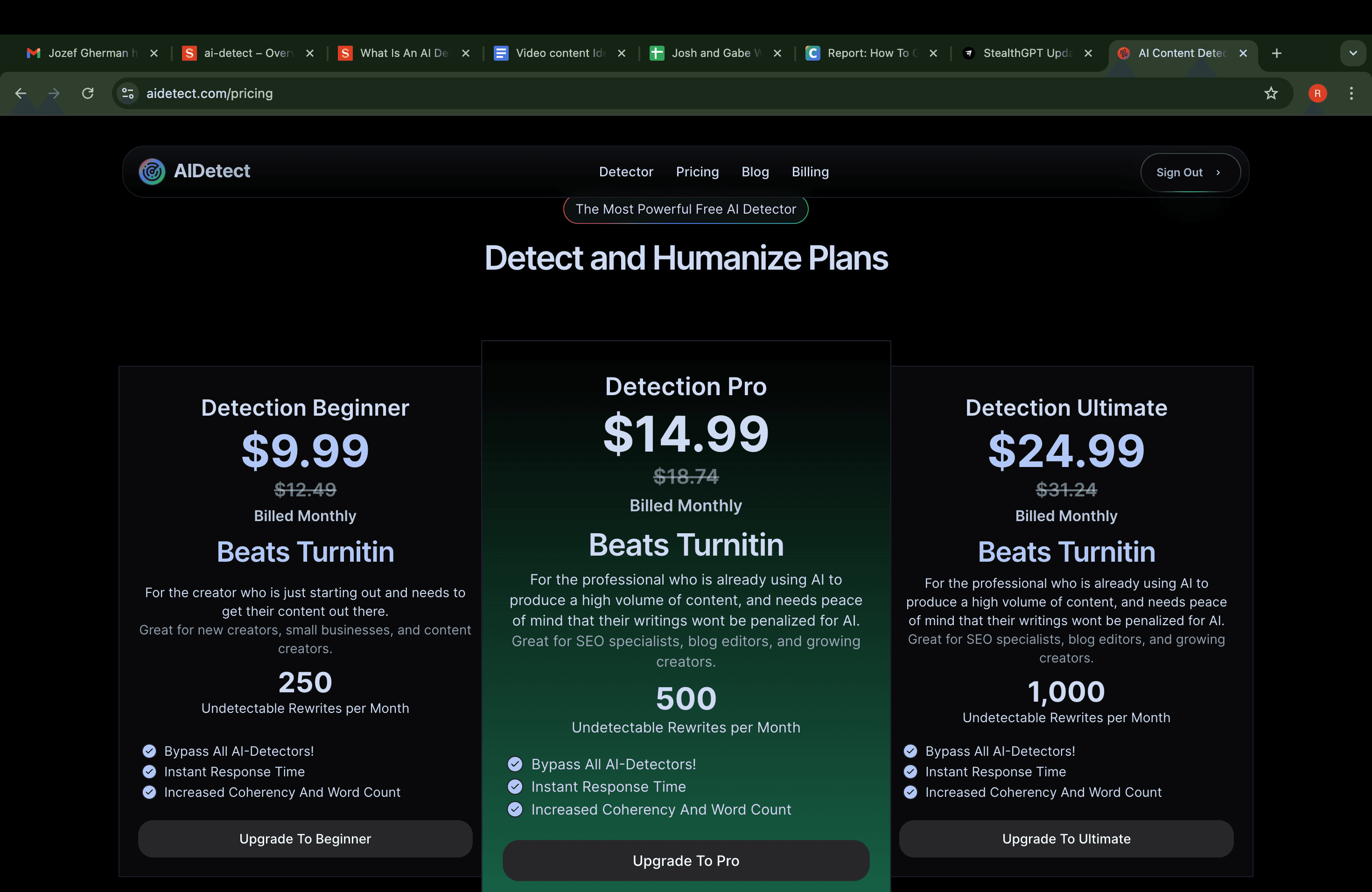 The largest two companies in the space are Turnitin, who’s software is integrated into Blackboard and Canvas, the two major student submission portals, and Originality.AI. Other such companies that are less popular but often used include GPTZero, ZeroGPT, Copyleaks, Content at Scale, Quillbot, and many more.These competitors offer the same service, but many seem to have less functionality detecting AI writing. Some seem to simply spit out a score without truly analyzing it. Additionally, these AI detector tools usually run a pretty penny if you want to subscribe to their service. And if you’re a student or content creator that wants to use Turnitin, you can’t easily gain access.That’s why the only service in this market without any problematic ethics is AI Detect. For free, you can use AI Detect to run a piece of text without a word limit and learn whether it’ll be detected as AI writing or human writing. AI Detect is for everyone, content creators using AI and the moderators reviewing their work. To give you an example of AI Detect's capabilities, here’s how undetectable text fares against Turnitin, Originality, and AI Detect: