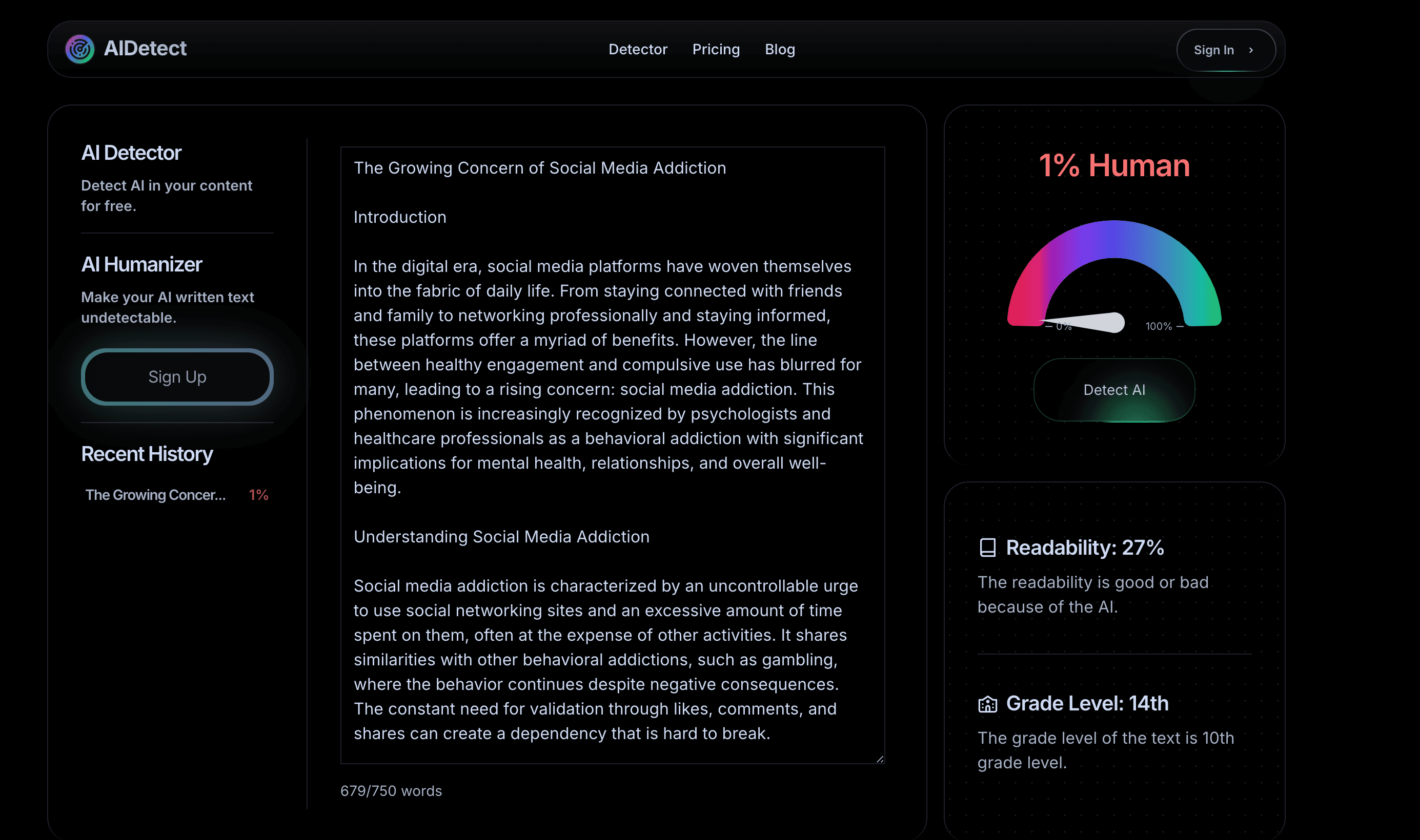 As you can see, you’re given a human score, which ChatGPT scored 1% on, meaning it was determined to be completely AI written. You get a readability score, because AI writing has low readability and you get a grade-level score, to show you how understandable the writing is.Once you sign up and subscribe to AI Detect, you also get access to our AI humanizer, which can take your ChatGPT text and make it high-quality undetectable text, so AI detectors can’t flag your work.If you’re a professional in content creation or SEO, or you’re a student or teacher, AI Detect’s toolkit comes incredibly handy to optimize your content and workflow.