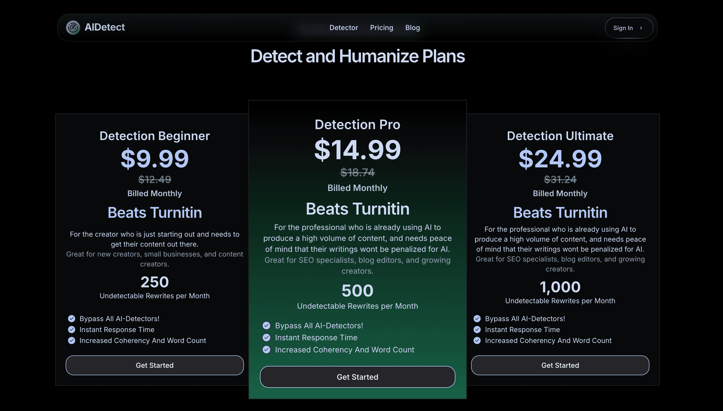 AI Detect is the free, inclusive AI detection system intended to offer judgement-free AI tools for both creators and moderators whether you want to check your own content against an AI detector, or if you want to check someone else’s content being submitted to you.Professionals and academics alike use AI Detect already, see what the fuss is all about with the smartest, most user-friendly AI detector and humanizer combo. With better value than the competition and more capability in detecting AI text, our AI ups your content creation game in every way.Check out our pricing page to see what packages we have available to fit your needs.