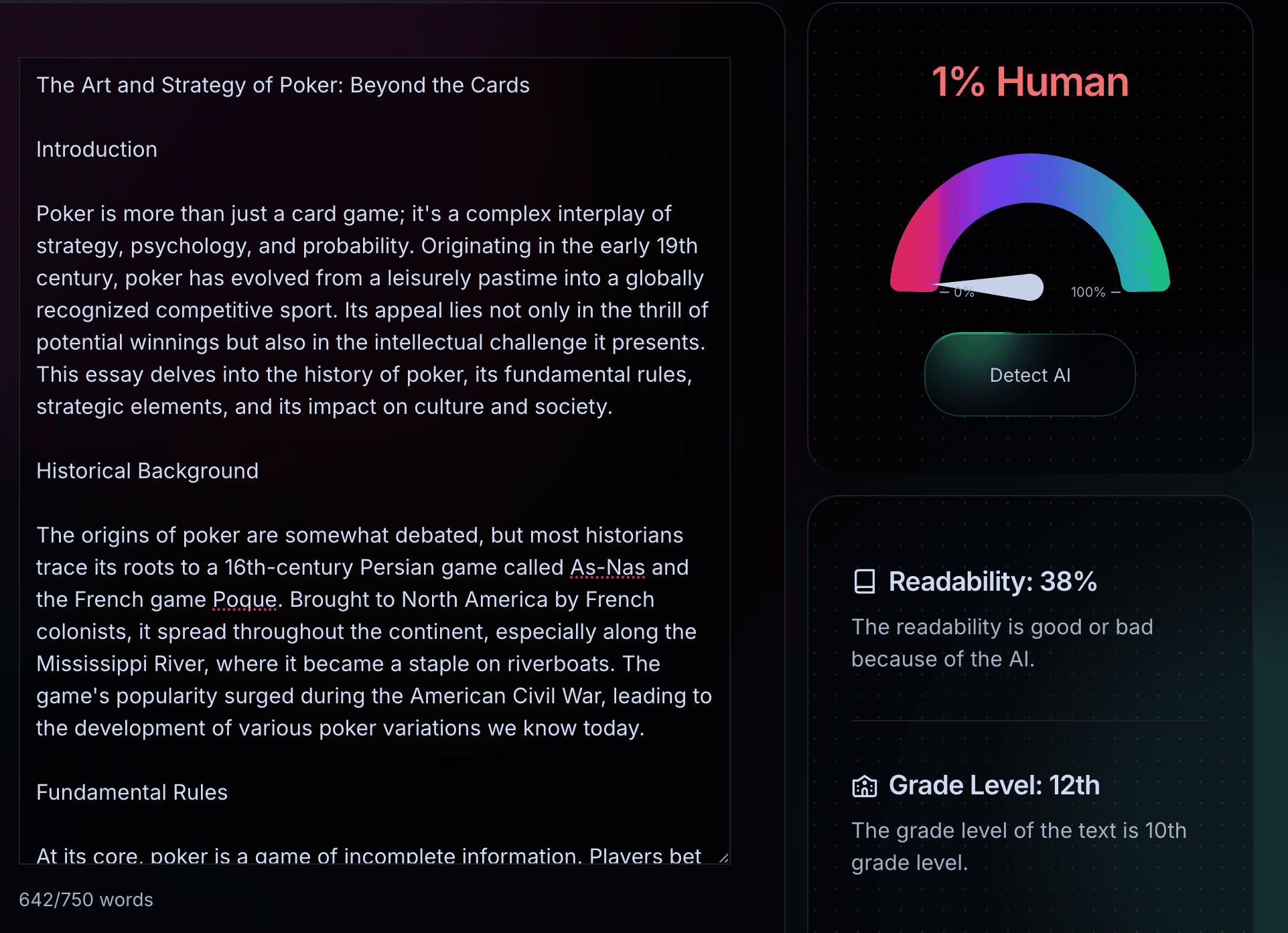 As you can see, AI Detect determined the text was 1% Human and given it was so clearly AI writing, the readability score of 38% also shows us how robotic the writing style feels.