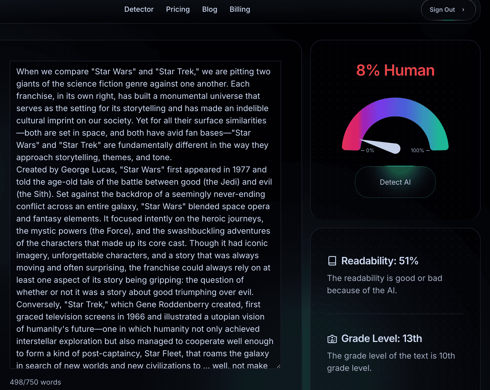 Powerful AI Detectors don’t just tell you if the piece of AI-generated content you pass through it is AI-written or not, they give you a score that tells you a lot about your text. In the case of AI Detect, you can learn about a piece of text’s readability and grade level to help you assess how well your text will fare once you submit it for people to read.Lets say you’re not just using AI detectors for fun though. Lets say you’re a student that wants to test your essay before submitting it to your professor to ensure you don’t get caught using an AI model then accused of plagiarism. AI Detect has an AI humanizer built in so you can simply click your text and make it submittable.Once humanized, your text's AI score should decrease to make it seem like you’re using human writing instead of AI writing. That might not be enough to get a professor off your scent though. If you want to ensure the investigation ends after you bypass AI detectors, you need your text to get a score of zero from AI detection.